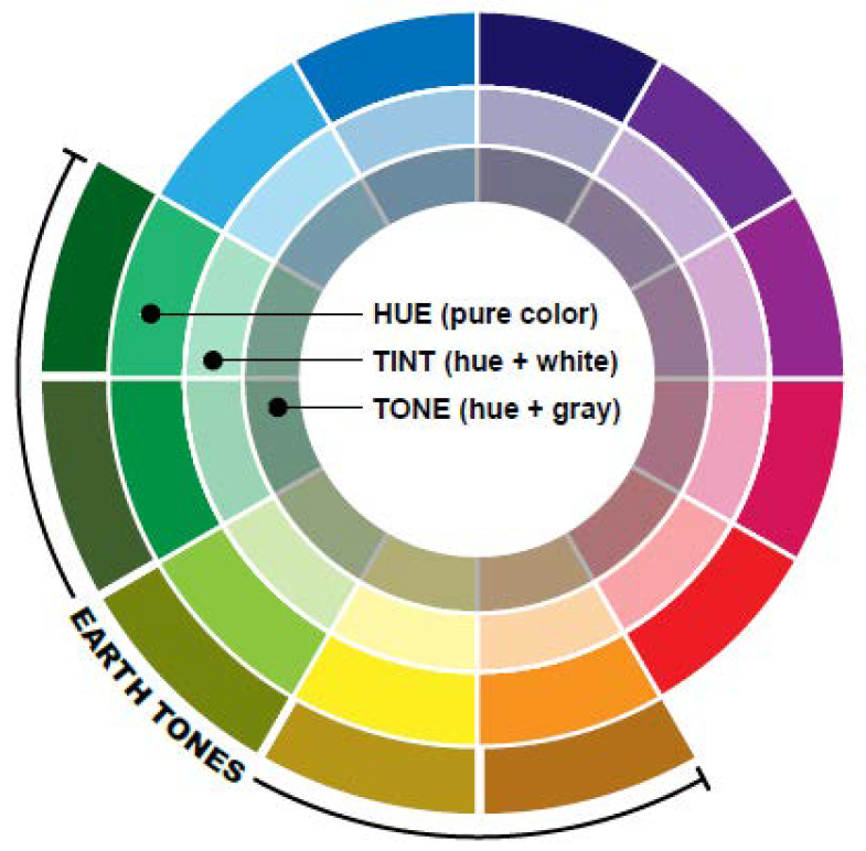 The outer ring of the color wheel illustrates the range of colors that are of an earth tone and are acceptable for use. Facade colors within the illustrated earth tone spectrum may vary in tint and tone but are not allowed to use the hue (pure color) as illustrated in Figure 18.64.050 H.