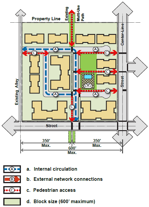 Unless otherwise noted, development shall comply with the Municipal Code design development standard requirements of the underlining zoned district in which they are located, including but not limited to front setback requirements, distance between buildings, required height, and lot coverage.