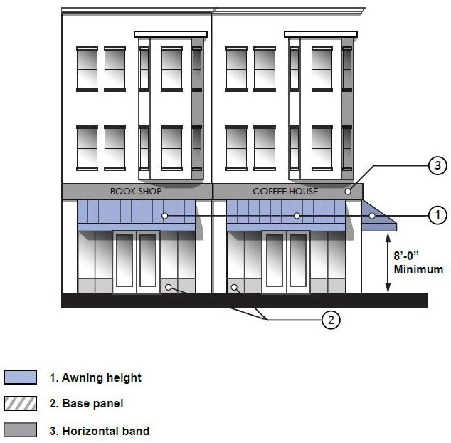 Awnings and Canopies. Awnings or canopies shall not extend horizontally beyond first floor non-commercial use window and door openings. Awning and canopy structural hardware shall not be lower than eight feet above the fronting sidewalk finished grade elevation. Signage or branding graphics of any type are prohibited on the exterior surface of the awning or canopy.