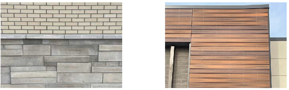 Materials outlined in 31-18(F)(4) covering at least 50 percent of the area when applied to the front building façade or 25 percent of the area when applied to a side or rear building façade.
