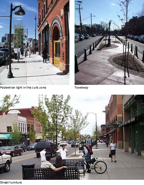 Curb zone The area from the inside of the curb to the sidewalk. This zone is where streetscape elements such as street trees, trash receptacles, bollards, news racks, benches, bike racks, and light fixtures should be located.