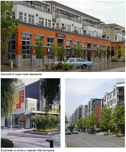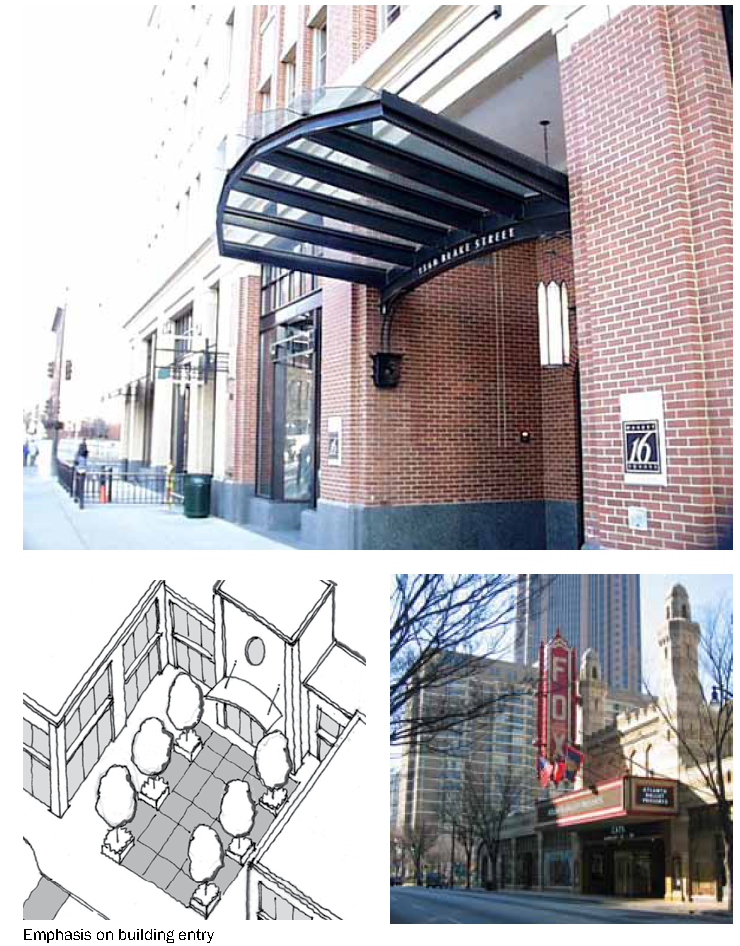 Emphasis of building entries through projecting or recessed forms, detail, color or materials;