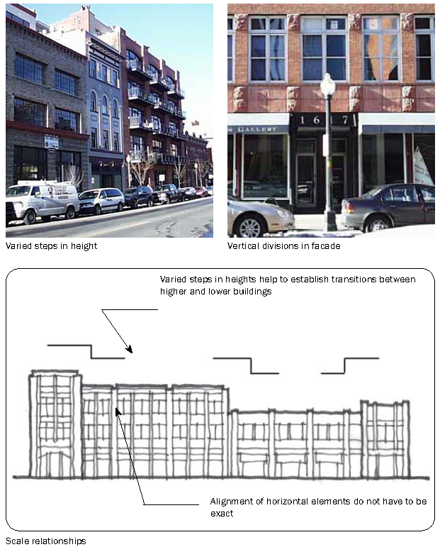 Taller buildings adjacent to lower buildings shall establish scale relationships with lower, neighboring buildings through methods such as: compatible horizontal alignment of architectural features and fenestration, and height and form transitions from one building to another.
