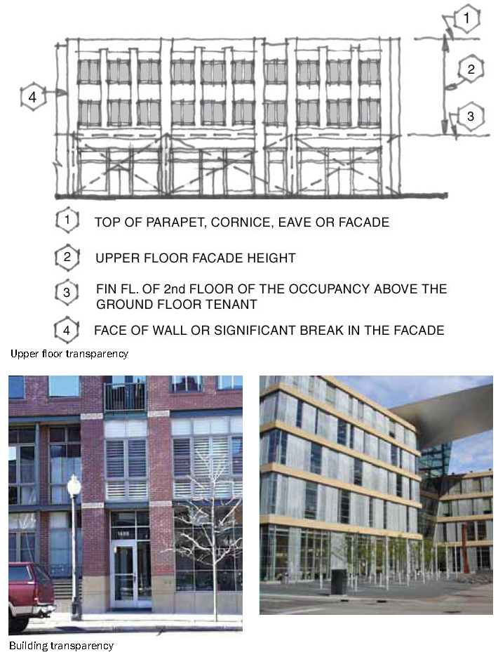 Each 'base' should have a greater level of transparency than the 'middle' or 'top' along the primary facade.