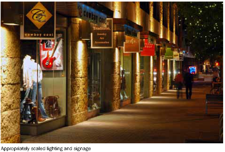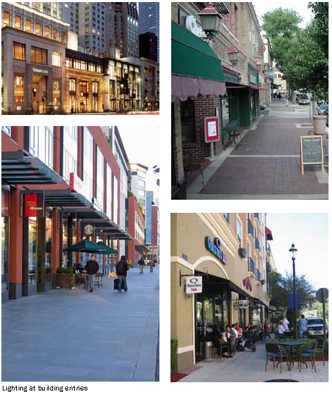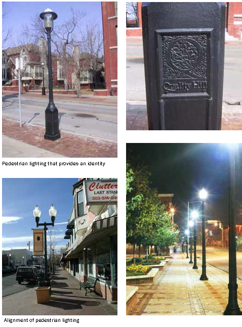 Pedestrian lighting Lighting that illuminates the sidewalk at a level that is consistent with pedestrian activities rather than vehicular activity.