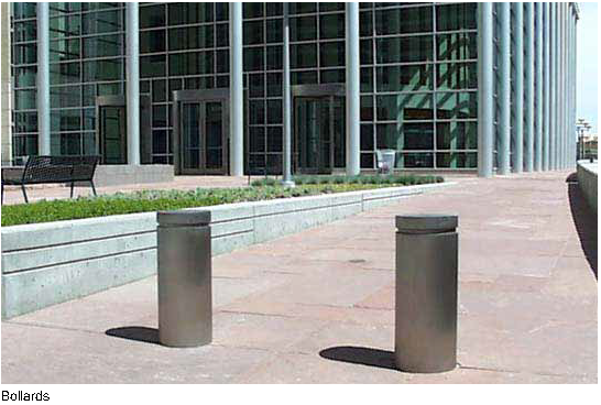Bollards A three to four foot tall post or column constructed of concrete, stone, or metal designed to separate pedestrian and vehicular traffic, define property lines, protect a work of public art, or otherwise for property protection, traffic control and pedestrian safety.