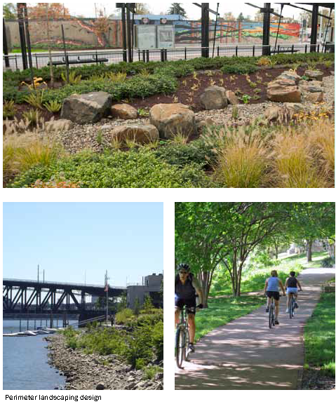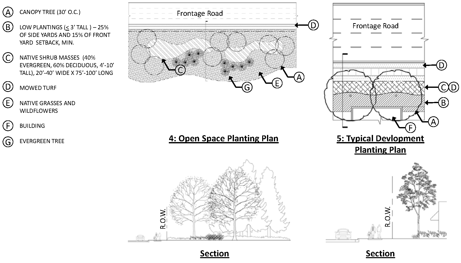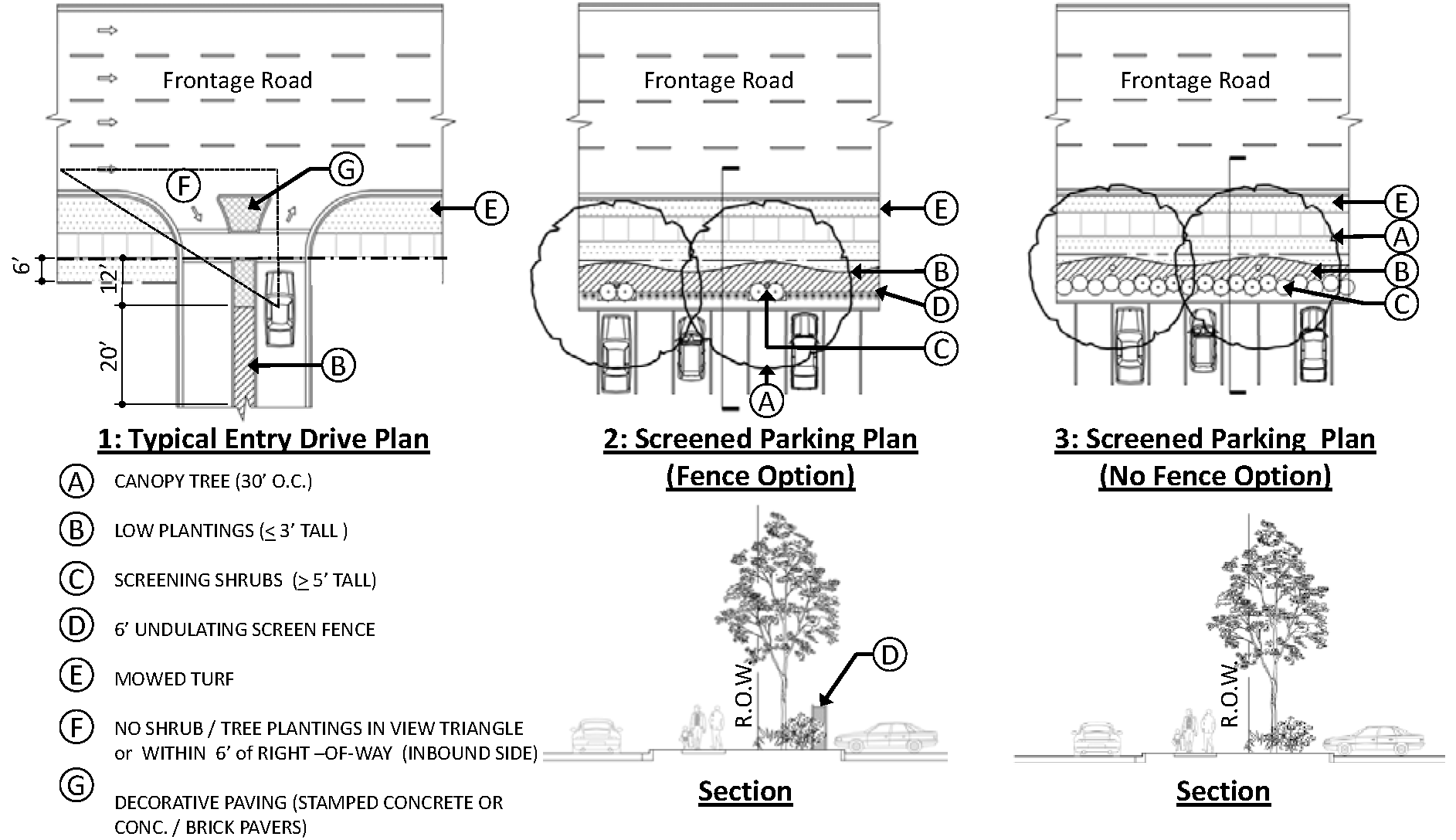 The following diagrams address the transition between the M-150 and I-49 frontage roads and adjoining land use conditions including entry drives, screened parking lots (with and without fencing), open space and private development. Specific standards are shown on the diagrams.