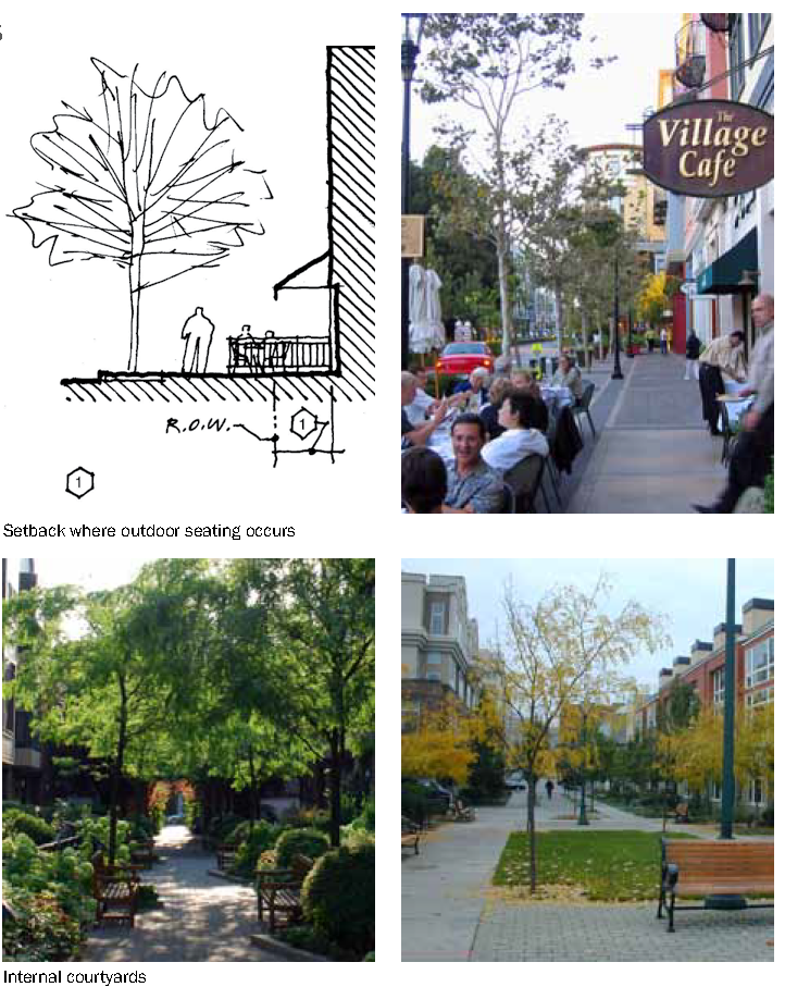 Street trees Trees located in a tree lawn or tree grate to provide an effective canopy over the sidewalk and portion of the street.