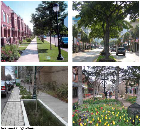 Tree lawns A landscaped strip between the back of curb and sidewalk in which street trees may be located.