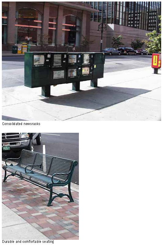 Street furniture Elements typically located in the public right of way for use by pedestrians such as benches, trash receptacles, and bike racks.