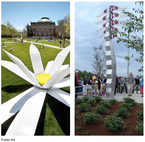 Public art Art located in the public realm such as in a plaza or as a part of the streetscape.