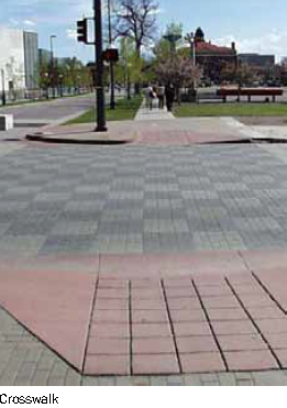 Crosswalk Portion of a roadway designated and marked for a pedestrian crossing, typically at intersections, but potentially at designated midblock locations.