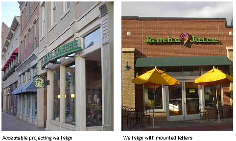 Projecting signs Typically attached to a building and cantilever horizontally over the sidewalk.