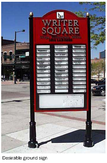 Ground signs are defined as monument signs, pole signs, and other signs that are attached to the ground. Ground signs should be refined, creative and unique.