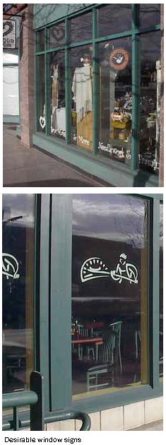 Window signs should avoid clutter 1) within the text and graphic components of the window signs, and 2) in combination with the objects of view through the window.