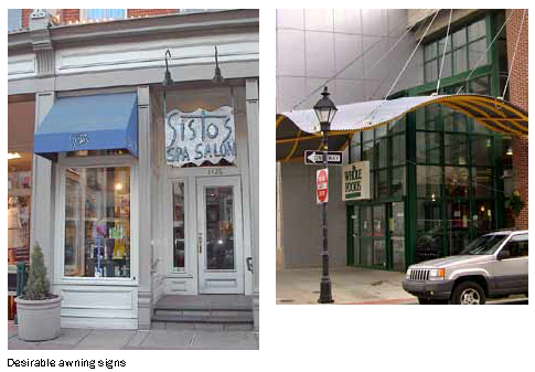 Awning signs should be carefully controlled so as not to become substitutes for wall signs or projecting signs