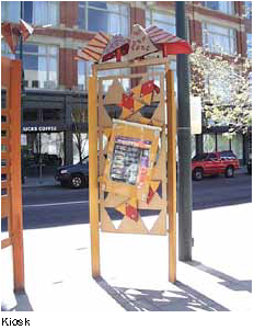 Kiosks A display element for timely information to help pedestrians find their way, direction them to destinations, or provide information on activities.