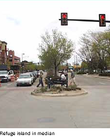 Refuge Island A non-traversable section of median or channelization device on which pedestrians can take refuge while crossing a street.