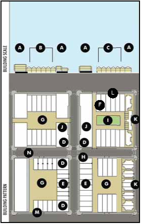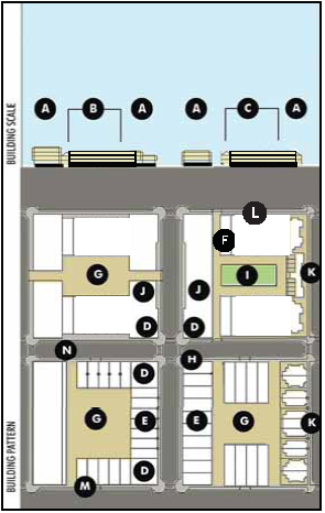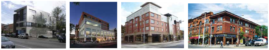 The development zone is established by the property line and design recommendations are provided through the Design Standards and Guidelines that will be created. It is important that the design of buildings and entrances appropriately interfaces with the design of the pedestrian and amenity zone.