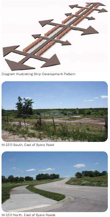 Utilities: Parcels north of M-150 include water, but lack sewer east of Byars Road. Vacant parcels south of M-150 lack sewer and water, which will require future infrastructure investment.