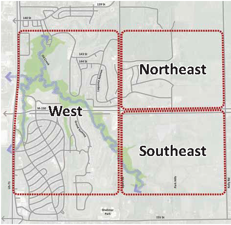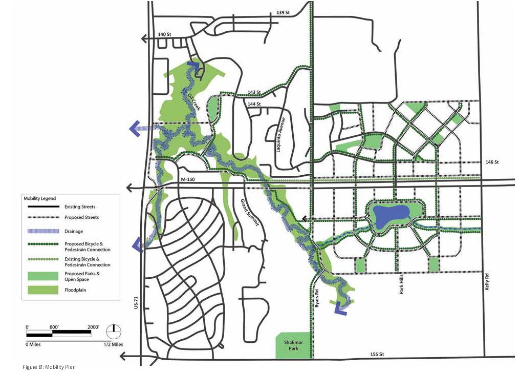Byars Road: Serves as a primary conduit of access north and south of M-150; this plan anticipates the eventual extension of Byars Road south to 155th Street. The two-lane street would curve to slow traffic speeds, and respect the natural topography and character of the area. Byars Road is envisioned as a green street/recreational corridor with sidewalks and multi-use paths that connect park facilities at 155th Street to the community recreation center north of M-150.