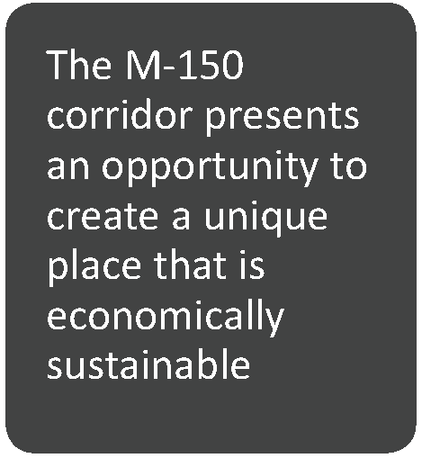 Sense of Place: The character of the M-150 corridor is lacking in a cohesive identity and sense of place. Instead of a destination, the area is often overlooked as a pass-through to reach areas outside of the corridor. Integrated development standards and aesthetic improvements could lead to a unique place in the region.