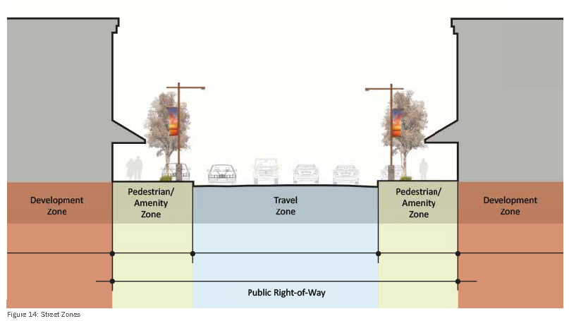 An objective of this plan is to establish an overall streetscape character framework and hierarchy of streets. For the purposes of analysis, each existing and proposed street can be divided into three zones: the travel zone, pedestrian zone and development zone. Refer to Figure 14 for a depiction of the zones. Design principles for the travel and pedestrian zones are included in the Corridor Character Principles section of the Appendix.