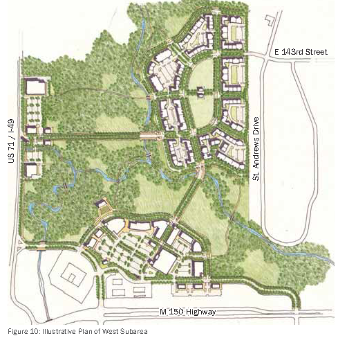 Grandview benefits from easy access to the metro area, a large park network, affordable housing, and a small town feel within a suburban setting. The M-150 corridor has been targeted as an area of future growth opportunity for the City. The area is the last large developable area with direct regional access. The manner in which this key area develops will determine the future quality of life for all of Grandview's residents and businesses. In many ways this area is a blank slate to create a new development pattern along the highway; a pattern of new compact, mixed-use sustainable development with a common theme and identity. This style of development could focus on a mix of residential, commercial and office spaces, and be a self-sustaining place with new schools, trails, open space and other community services and amenities. A vision for redevelopment requires addressing the issues in detail.