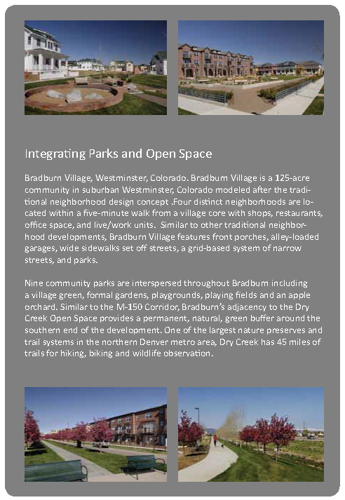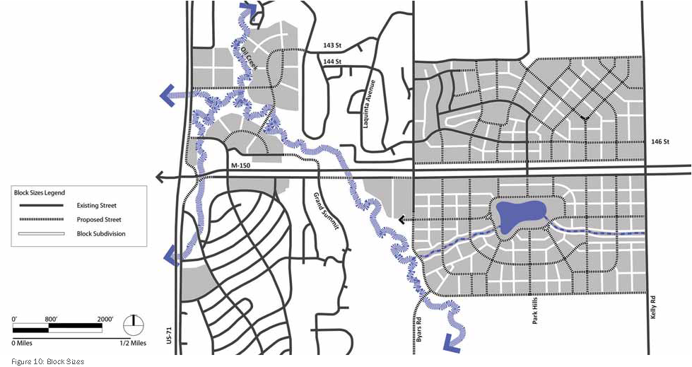 Greenways and off-street trails: The Oil Creek greenway currently extends across the M-150 corridor. This greenway should be preserved and enhanced as an amenity for existing and future neighborhoods. Off-street trails through the greenway should link to the proposed system of green streets and neighborhood parks. Trails can connect residents to neighborhoods and commercial uses outside of the immediate study area (north and west). South of M-150, drainages flow into the existing pond, and could be transformed into landscaped natural corridors with walkways and bikeways along them. Connections to bikeways through street bridge crossings and at low-flow mid block crossings ensure continuity of access.