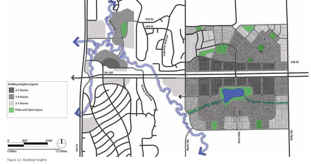In order to ensure new development is compatible with existing development, the plan proposes different building heights along the corridor. The highest buildings proposed, between four and six stories, are planned for the blocks surrounding Park Hills Drive. Three to five story buildings are proposed along the backage streets within one half mile on each side of Park Hills Drive. Development outside of these areas is proposed to be two and three stories. This pattern provides development focus at Park Hills Drive and the associated planned amenities located both north and south of M-150, while providing compatible development heights adjacent to existing single family residential neighborhoods. (Figure 11)