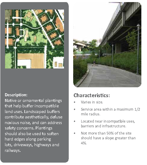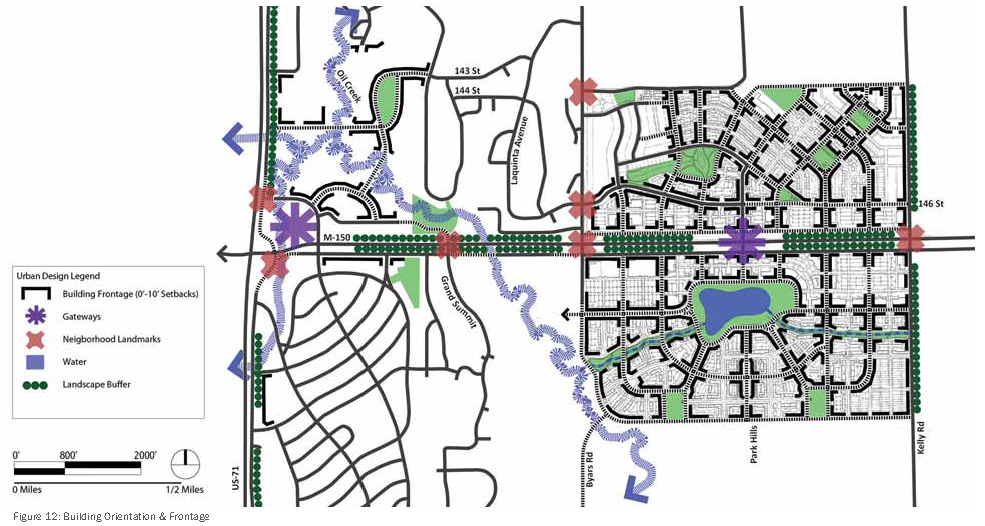 Landscape Buffer: Landscape buffers are proposed along M-150, US-71 and Kelly Road to protect sensitive uses from highway noise and views. These buffers could enhance the aesthetics of the roadside and create a unified character. The buffers are punctuated at and around key intersections (US-71/M-150, Byars Road and Park Hills Road) to ensure visibility and enhanced ingress/egress onto frontage streets and local streets.