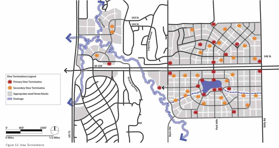 An important element in the creation of place is the visual experience. To this end, it is important to consider view termination - the building, monument, or open space seen when looking down a street. The map below shows the important view termination points and sight lines that must be considered when designing a building or laying out development on a parcel. The view must be considered in the design and will require higher quality architectural and design treatments. At a minimum, view termination points cannot include trash enclosures, service entrances, or truck access. The view terminations are based on sight lines from the road alignment. Additionally, view terminations should focus on gateways and landmarks located within neighborhoods when appropriate. (Figure 13)