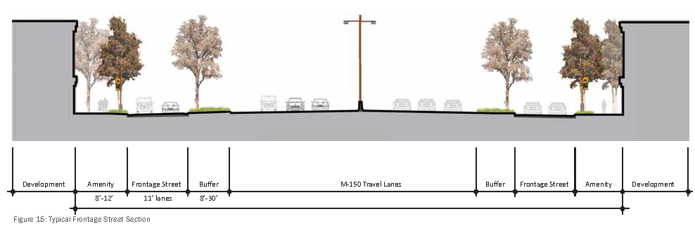 Planting strips of various widths would be provided between the highway and the frontage streets and between the frontage streets and pedestrian pathways. Access from the frontage streets should be limited to the north-south streets. Access to parcels adjacent to the frontage streets and M-150 will be accomplished through backage or reverse access streets.