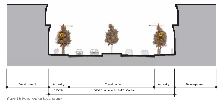 Arterial streets provide high capacity mobility between the backage and local streets to the highway and other arterials connecting throughout Grandview. Byars Road and Park Hills Drive are envisioned as 4-lane arterials, including a landscaped median; two, 10 and half foot travel lanes in each direction; an 8-foot sidewalk on each side; and tree-zones on each side separating the roadway from the sidewalk. (See Figure 16)