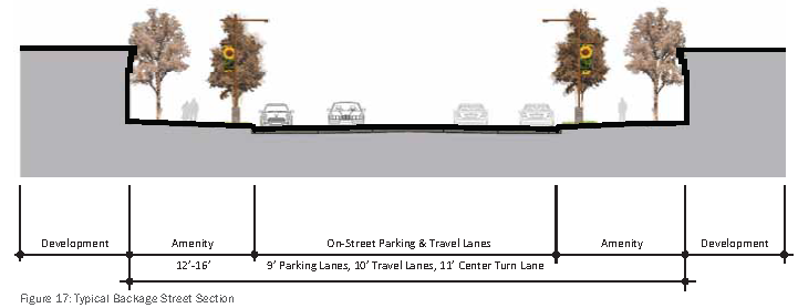 Backage streets serve as a parallel facility to the highway, designed to operate at slower speeds; they create opportunities to travel east-west through the corridor without requiring travel on the frontage streets or M-150. The desired outcome is to create a pedestrian-friendly street roughly parallel to M-150. The backage streets should have one 10-foot wide travel lane in each direction and a shared 11-foot wide center turn lane. They should include a 9-foot parking lane on each side; a 6-foot tree-zone, and 8-foot sidewalks. (See Figure 17)