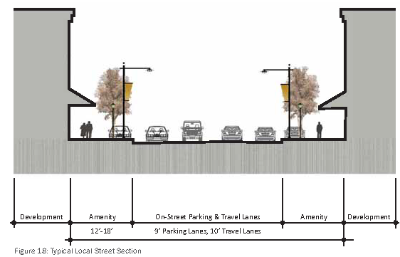 The local street type encompasses both collector and local streets. Both have similar characteristics and function in connecting between uses. Collectors are designed to provide a balance between mobility and land access within residential, commercial and industrial areas. The makeup of a collector street largely depends on the density, size and type of nearby buildings. Local streets typically carry lower traffic volumes and provide access within and between neighborhoods and businesses. Local streets typically vary between two to three 10-foot-wide vehicular lanes total, and have a 12 — 18-foot-wide pedestrian zone to encourage walking (See Figure 18). General characteristics include: