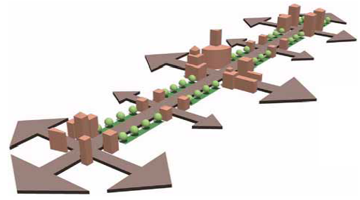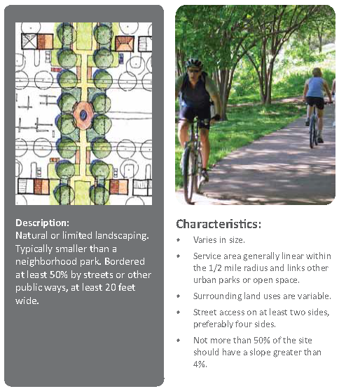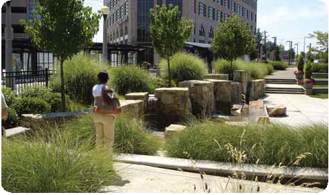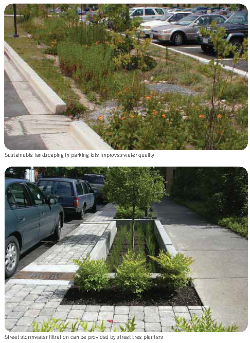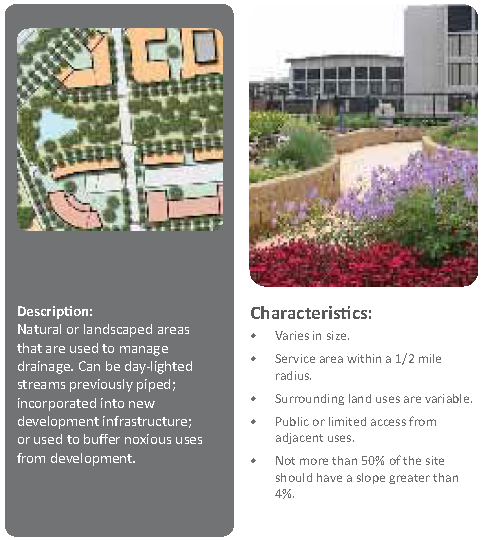 Green Streets: Green streets are intended to carry multiple transportation modes (walking, bicycling and transit) within an interconnected network of streets. Green streets are proposed within the development districts to link parks and open spaces together. They should serve as vegetated corridors with a mix of native plantings and include stormwater management devices (bioswales, vegetated strips, etc.).