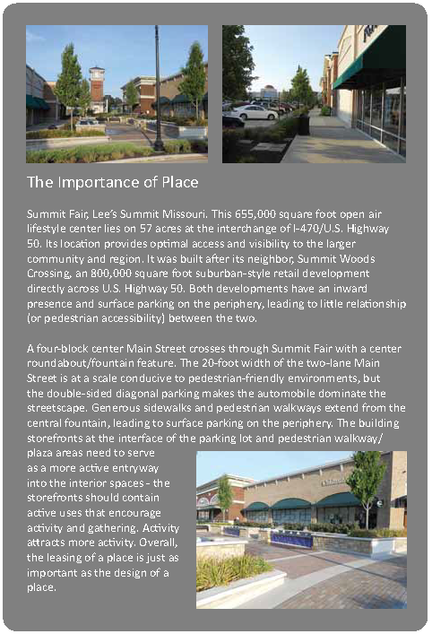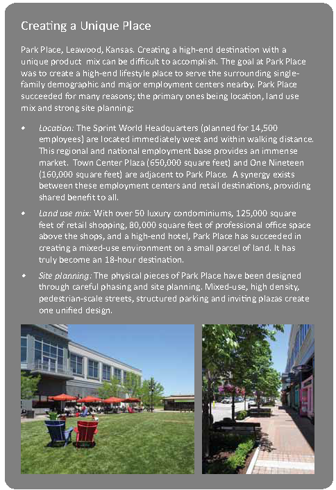 Regional competition: The M-150 corridor currently lacks competitive advantage for retailers to locate here. The retail market is generally weaker than the rest of the region, and numerous major shopping destinations are located within the market area (Centers in Leawood, Belton and Lee's Summit are examples, along with Grandview's Truman Corners). New development along M-150 will need to be high-quality to compete against larger regional centers. According to the Urban Land Institute (ULI), the most promising retail formats in the coming decade include mixed-use town centers with office and residential uses, neighborhood/community shopping centers and urban entertainment centers with movie theaters.
