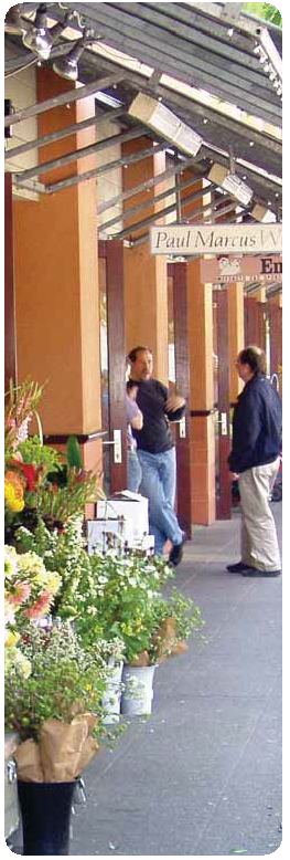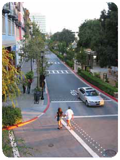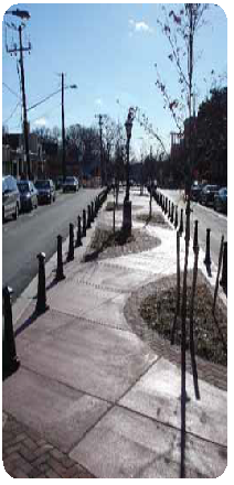 The pedestrian/amenity zone is the section of the street needed to move people between land uses, and between vehicles and land use. This environment includes sidewalks, curb and gutter, bus stops and street furniture such as lighting and benches. Street trees, tree lawns and planter boxes are typically located in a green area which separates the pedestrian walkway from the traffic zone. The pedestrian/amenity zone is the interface between the development zone and the travel zone. A high quality pedestrian environment is essential on streets to encourage street activity and provide for a safe and inviting area.