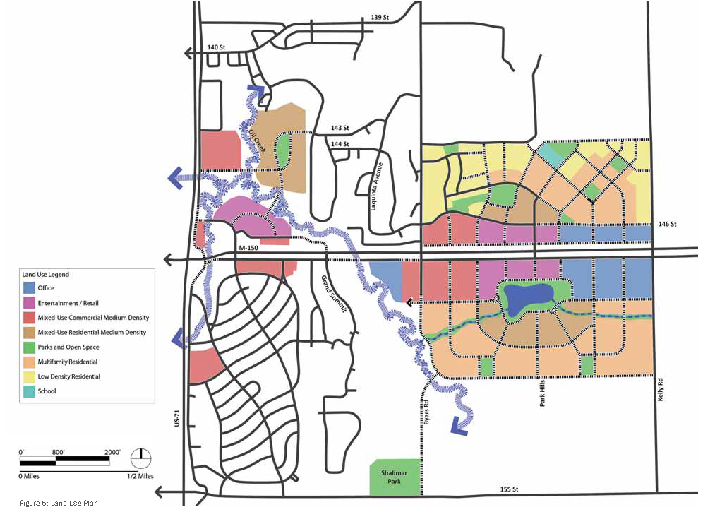 M-150 Corridor: The corridor was recently expanded based on its significance as a regional transportation facility, and is sufficient to handle existing and future traffic volumes and provide improved ingress and egress along a series of frontage streets. These improvements, along with the improved interchange at US 71, and the conversion of US 71 into an interstate highway, will attract new regional and national attention for development.
