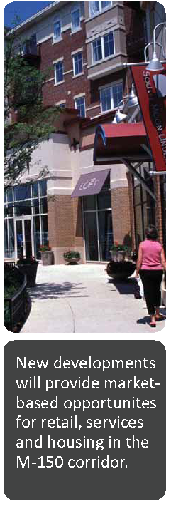 It is possible that the M-150 corridor could develop as a strong and sustainable economic engine and provide higher revenues than previously approved development plans for this area. By mixing uses, increasing density, the M-150 corridor could become a regional destination; a place where people can live, work, shop and play. Increased densities could leverage a higher tax base and provide the community with the financial resources required achieve and improved quality of life.