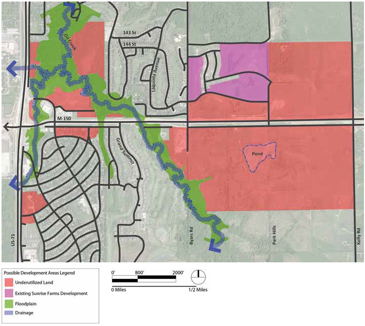 The lands east of Byars Road and south of M-150 lack access to water and sewer. Sewer can be accessed from the LBVSS without any special conditions, and connecting to the interceptor which runs along Oil Creek. Water can be extended from a main along Byars Road running south from the existing tank. The water district is planning to develop a new tank in the section of land east of Kelly Road. Additionally, water may be access from the Belvedere area.