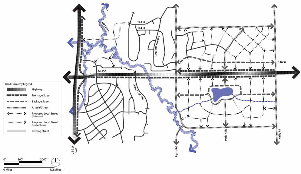 Access management policies are critical to the successful functioning of a connected street network at regional and local scales. Signalized intersections along M-150 provide the primary access into new development along M-150 and are located at White Avenue, Grand Summit Boulevard, Byars Road and Kelly Road. A future traffic signal is envisioned at the intersection at Park Hills Road to provide additional north-south access and connectivity across M-150. The following principles provide access recommendations for streets and intersection design.