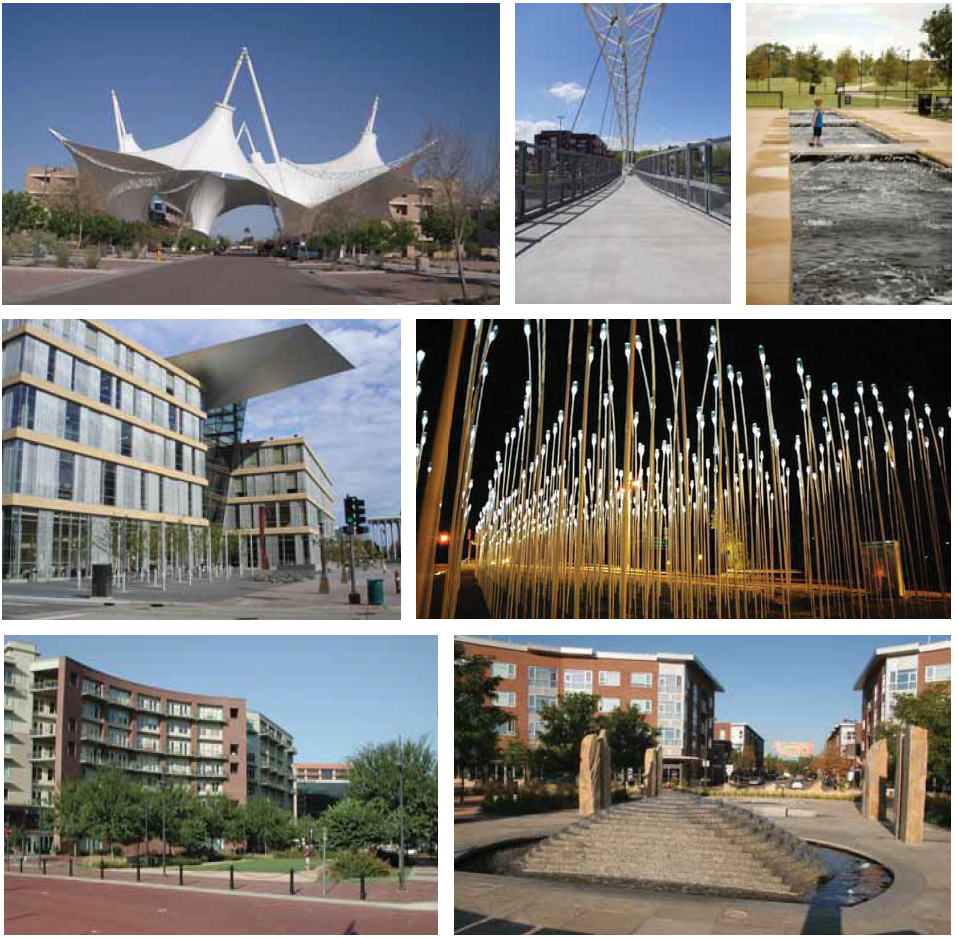 The design of spatial elements located along the highway rights-of-way, including retaining walls, landscaping, signage, accent lighting, and any new bridges, will be a prime contributor to the character and identity of the corridor. Artist input should be included in concept development of elements located in the rights-of-way, and the designs should emphasize themes consistent with the vision set forth in this Plan. The intent is to create a visually exciting experience for those traveling along the corridor. Reflections and inspirations can be interpreted and integrated into infrastructure design, and new design should strive to: