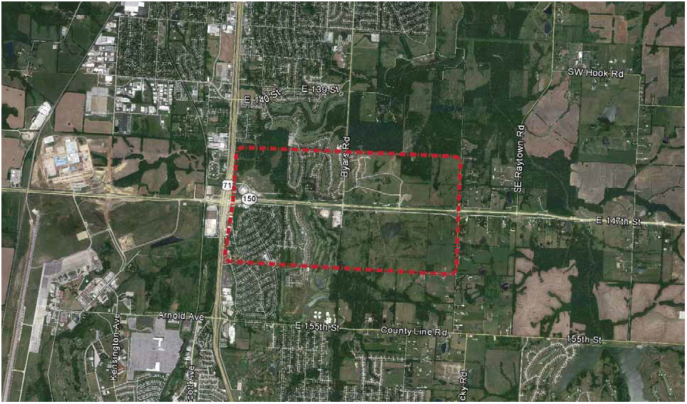 The Missouri 150 Highway corridor through Grandview is a two mile corridor extending east from the interchange with US-71 highway/Interstate 49 to the city limits at Kelly Road. The study area for this Plan extends approximately one-half mile north and south of 150 Highway. The study area is bisected by Byars Road, which divides the area into an east and west area.