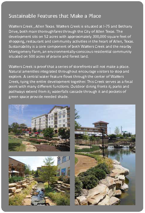 Sustainable places are those that encourage people to walk, bike, or ride the bus rather than take their personal vehicles. Each of the three subareas described earlier in this document need a circulation framework that maximizes opportunities for multiple mobility modes. Realizing this vision will require the provision of sidewalks, multiuse paths, bike lanes, appropriately-designed pedestrian and traffic lighting, landscaping, and signage. For example, pedestrian-scale lighting needs to be positioned over the sidewalk, rather than over the street. Improving sidewalk illumination can increase pedestrian traffic and enhance community safety. Landscaping can provide shade and generate visual interest to draw walkers down the sidewalk; that same level of visual interest can subconsciously slow down drivers. Pedestrian-friendly signage provides visual appeal and does not block sidewalks and walkways.