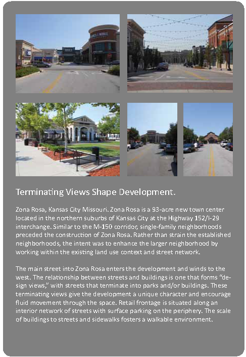 The M-150 development frameworks previously discussed represent an illustration and guiding principles to implement Grandview's vision for enhancing economic development along the corridor. MoDOT's expansion efforts in the corridor will help catalyze this transformation, but more definitive recommendations are required to achieve the vision set forth in this Plan. The character framework plans provide the guiding principles for the character of development the City of Grandview desires in this corridor. The plans are described in terms of Development Pattern Principles, including overall block sizes and building height, and Urban Design Principles, describing building frontage, view terminations, right-of-way treatments, landmarks, and sidewalks and bike paths. These plans shall be used when reviewing any development within this corridor to ensure long term compatibility for successional development, and compatibility of the goals and principles set forth in this plan.