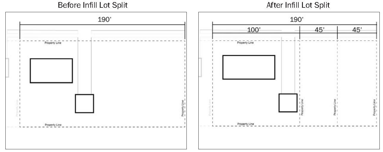 When a lot split occurs in an existing developed subdivision and the Parent Lot cannot meet the maximum lot width dimension, the property line subdividing the lot shall be drawn to maximize the density allowed under the Bulk Regulations of this section for the newly created lot or lots. This may be done so by drawing the lot line nearest to the existing building side yard setback. When this occurs, the Parent Lot will be compliant with this Ordinance, regardless of its lot width and/or overall lot area.