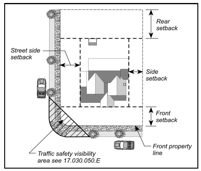 Street Side Setback. The side setback on the street side of a corner parcel shall be measured from whichever of the following points results in the greatest setback from an existing or future roadway: