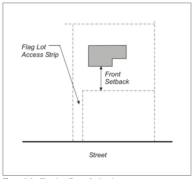Flag Lot. The front setback on a flag lot (a parcel with a fee ownership strip extending from a street or right-of-way to the building area of the parcel) shall be measured from the nearest point of the wall of the structure to the point where the access strip meets the bulk of the parcel; establishing a setback line parallel to the lot line nearest to the public street or right-of-way. See Figure 3-2. Standards for new flag lots are in Subsection 17.88.030.F.5.d (subdivision layout standards - flag lots).